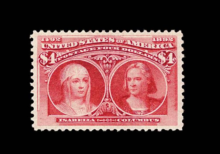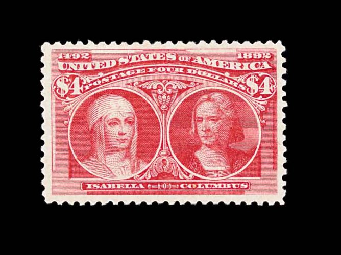 426 og 244a image#244a, $4.00 Columbian, the rose carmine shade, a gorgeous mint example of this distinctive shade, magnificently well centered within very wide margins, extraordinarily bright and fresh, with beautiful color that is in a far deeper shade than typically associated with the rose carmine color, very fresh paper as well, full clean o.g. that has been relatively lightly hinged, an extremely fine gem; few Four Dollar Columbians with original gum are found in such outstanding condition; 1994 PF certificate. (Image) 3,000.00
