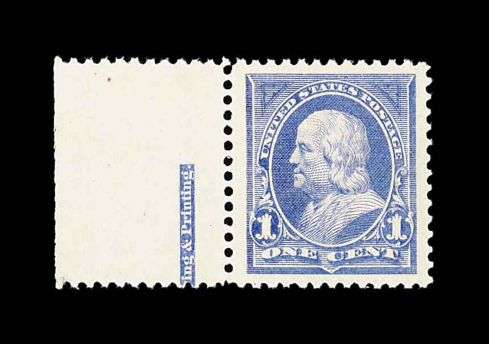 428 nh 246 image#246, 1c Ultramarine, left sheet-margin partial imprint single, flawlessly centered amid immense jumbo margins, bright fresh color, o.g., n.h., extremely fine; a most impressive large-margined gem that is seldom seen this choice; 1988 PF certificate for an imprint and plate number strip of three from which this stamp was taken. (Image) 60.00