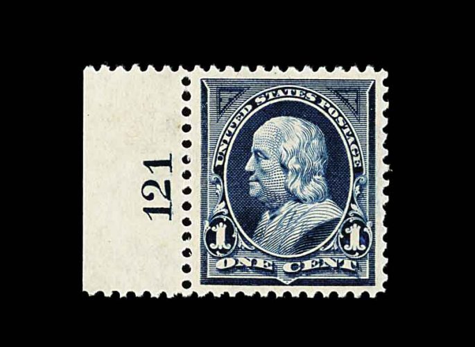 429 nh 247 image#247, 1c Blue, left sheet-margin plate no. 121 single, incredibly well centered, wide margins, strikingly intense color and impression on bright paper, pristine o.g., n.h., extremely fine gem; 1992 PF certificate for an imprint and plate number strip of three from which this stamp was taken. (Image) 125.00