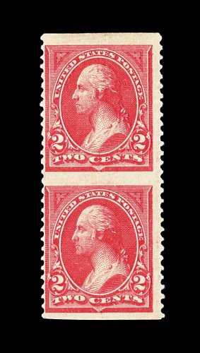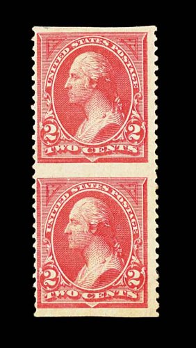 431 og 248a image#248a, 2c Pink, Ty. I, vertical pair, imperforate horizontally, a choice example of this very rare classic perforation error, radiantly rich color, full fresh o.g., lightly hinged, very fine; an enormously rare error, this being the only example we have ever seen; this very pair is illustrated in the 2001 Catalogue of Errors on U.S. Postage Stamps by Stephen R. Datz (page 16); 1980 PF certificate. (Image) 2,000.00