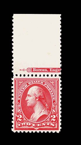 435 nh 251 image#251, 2c Carmine, Ty. II, select top sheet-margin partial imprint single, wonderfully bright and fresh, well centered, o.g., n.h., choice very fine; 1992 PF certificate for an imprint and plate number strip of three from which this stamp was taken. (Image) 460.00