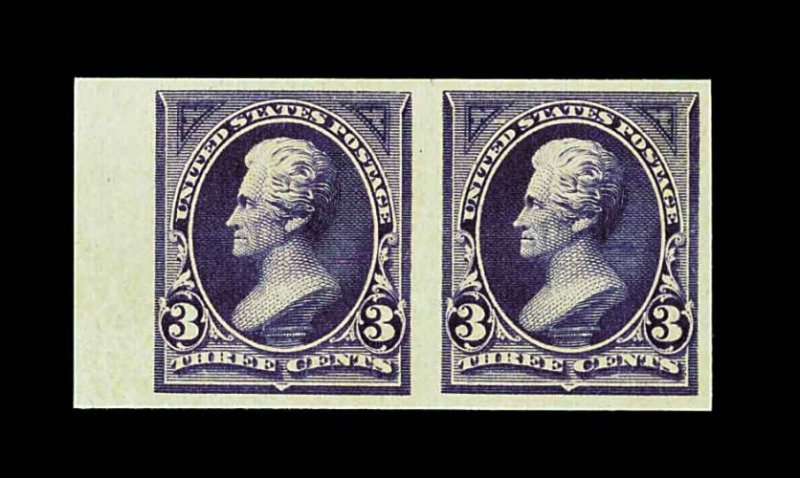 438 og 253a image#253a, 3c Purple, imperforate, left sheet-margin horizontal pair, large margins all around, sumptuously rich color, o.g., l.h., extremely fine; 1993 PF certificate for a block of four, this being the top pair. (Image) 350.00