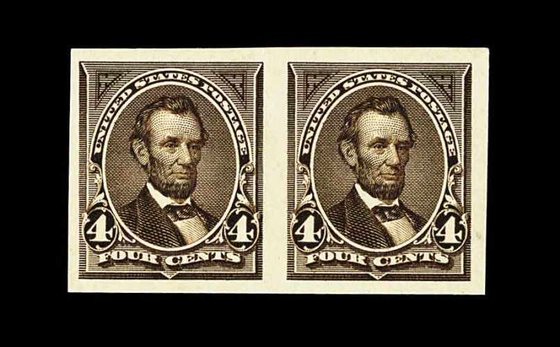 440 og 254a image#254a, 4c Dark brown, imperforate, horizontal pair, large to huge margins, rich color, o.g., extremely fine; 1991 PF certificate for a block of four, this being the top pair. (Image) 350.00