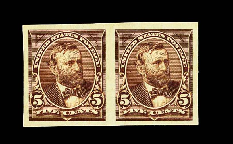 442 og 255b image#255b, 5c Chocolate, imperforate, horizontal pair, especially large and well balanced margins, rich color, o.g., l.h., extremely fine; 1986 PF certificate. (Image) 350.00