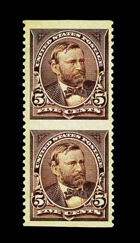 443 og 255c image#255c, 5c Chocolate, vertical pair, imperforate horizontally, an extraordinary quality example of this very rare error pair, incredibly well centered amid large margins, rich color, full o.g., extremely fine; no more than 50 pairs can possibly exist, and it is unlikely any other pair exists any finer than the one offered here; 1993 PF certificate. (Image) 2,250.00