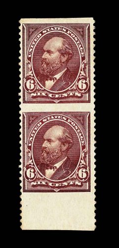 445 og 256a image#256a, 6c Dull brown, vertical pair, imperforate horizontally, an exceptionally choice bottom sheet-margin example of this rare error, possessing centering that is far better than most existing examples, plus it is free of the faults which affect the vast majority, deep luxuriant color, o.g., l.h., very fine; no more than 50 pairs can exist; 1996 PF certificate. (Image) 1,500.00
