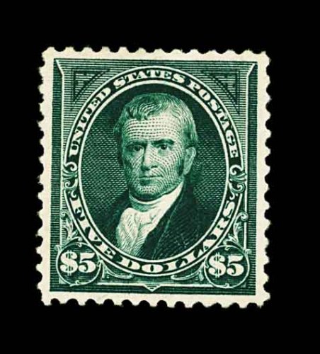 454 og 263 image#263, $5.00 Dark green, a marvelous quality mint example of this popular and difficult high value, possessing lavishly large margins all around which are seldom encountered, and being flawlessly centered within them, prooflike color and impression on bright white paper, o.g., relatively lightly hinged, extremely fine; a very rare mint stamp in any condition, as only 25,000 were issued, but only a tiny fraction of this number still exist in this gem condition; 1993 PF certificate. (Image) 4,500.00