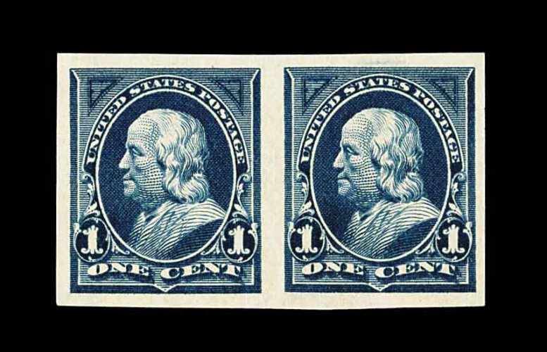 456 nh 264c image#264c, 1c Blue, imperforate, horizontal pair, large balanced margins, rich color, o.g., n.h., couple of trivial paper wrinkles, extremely fine. (Image) for hinged 325.00