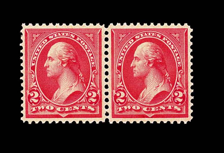 458 nh 266-67 image#266-67, 2c Carmine, Ty. II and III combination pair, a gorgeous mint horizontal pair containing both types, brilliantly fresh, radiant color, each stamp flawlessly centered within large margins, o.g., n.h., extremely fine; far more scarce than its catalog value would indicate, particularly in this gem condition. (Image) for hinged 70.00