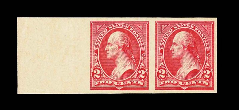 460 og 267a image#267a, 2c Carmine, Ty. III, imperforate, left sheet-margin horizontal pair, brilliantly fresh, deep luxuriant color, large even margins all around, o.g., l.h., extremely fine; quite scarce this choice; 1995 PF certificate. (Image) 300.00