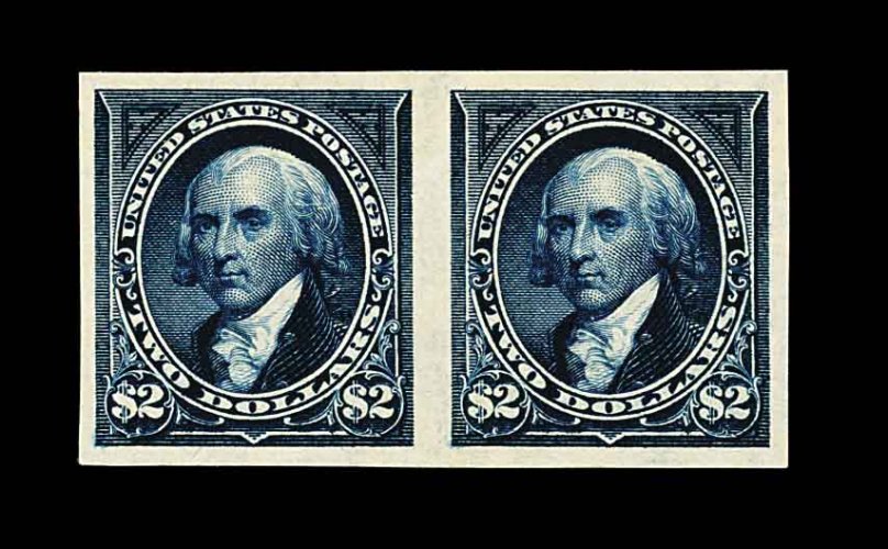 485 og 277b image#277b, $2.00 Bright blue, imperforate, horizontal pair, very large margins all around, sumptuously rich color and impression on bright fresh paper, o.g., lightly hinged, extremely fine; a particularly choice pair of this rare imperforate, of which only 50 pairs were printed; 1993 PF certificate. (Image) 5,000.00
