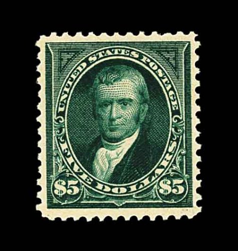 486 og 278 image#278, $5.00 Dark green, fabulously well centered amid extravagantly large margins which are most uncharacteristic of this high value, eye-arresting intensely rich color and impression on bright fresh paper, particularly clean o.g., lightly hinged, an extremely fine gem in every regard; especially rare in this highly desirable premium quality; 1992 PF certificate. (Image) 2,400.00