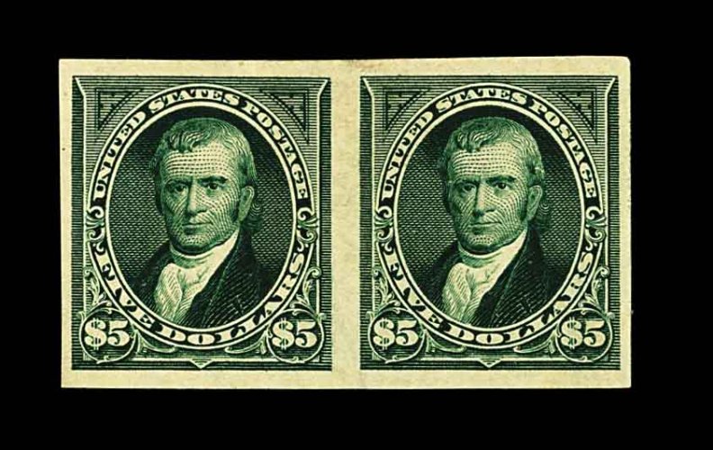 487 og 278a image#278a, $5.00 Dark green, imperforate, handsome horizontal pair of this imperforate rarity, large margins all around, deep luxuriant color, o.g., extremely fine; only 50 pairs can possibly exist, many of which are found with gum faults; 1992 PF certificate. (Image) 4,000.00