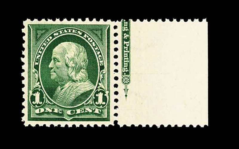 488 nh 279 image#279, 1c Deep green, pristine right sheet-margin partial imprint single, perfectly centered within large margins, radiant color, o.g., n.h., extremely fine; a little gem; 1991 PF certificate for an imprint and plate number strip of three from which this stamp was taken. (Image) 16.50