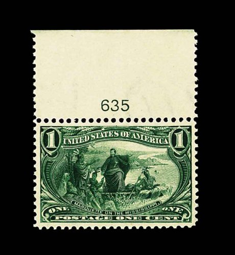 500 nh 285 image#285, 1c Trans-Mississippi, gem top sheet-margin plate no. 635 single, outstanding centering and margins, especially deep rich color, o.g., n.h., extremely fine; 1991 PF certificate. (Image) 55.00