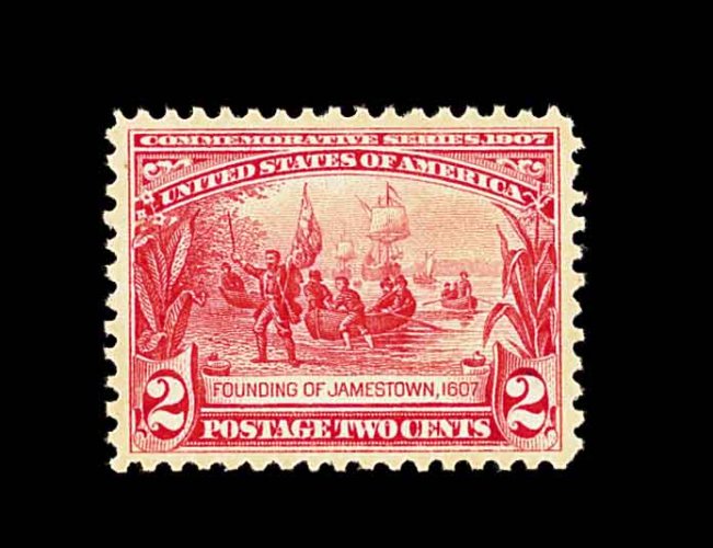 562 nh 329 image#329, 2c Jamestown, lavishly large and wonderfully well balanced margins all around, strikingly intense color and impression, o.g., n.h., extremely fine; a very scarce stamp so well margined; 1988 PF certificate. (Image) 65.00