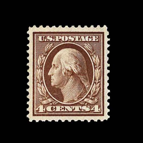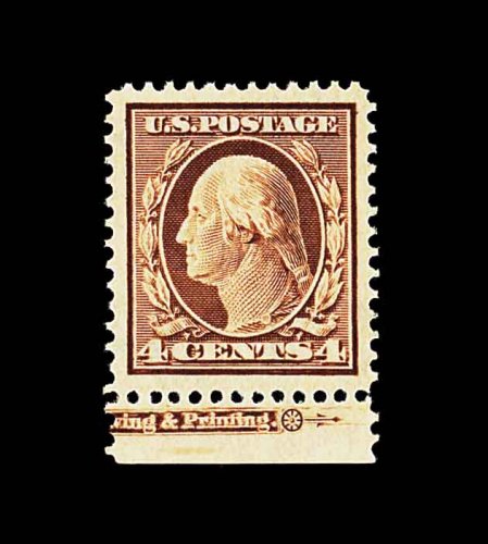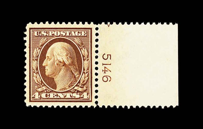 566 nh 334 image#334, 4c Orange brown, a superb bottom sheet-margin partial imprint single, possessing huge margins all around and being perfectly centered within them, rich color and an uncommonly detailed impression, o.g., n.h., an extremely fine jumbo; 1990 PF certificate for a block of four, this being the bottom left stamp; ex-Morris. (Image) 75.00