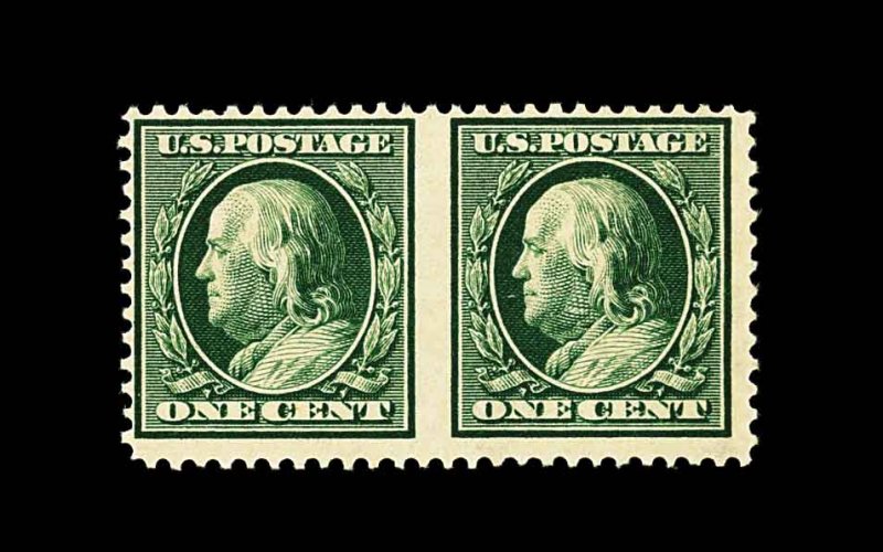 565 og 331 var. image#331 var., 1c Green, horizontal pair, imperforate between, fresh, rich color, o.g., lightly hinged, very fine; a most unusual and rare error that is not listed by Scott and, according to the Datz catalog, is from a booklet pane experiment; the first such example we have seen; 1993 PF certificate. (Image) Datz 1,000.00