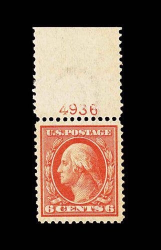 568 nh 336 image#336, 6c Red orange, brilliantly fresh and choice top sheet-margin plate no. 4936 single, radiant color, outstanding centering amid extraordinarily large margins, o.g., n.h. (hinged in ungummed portion of sheet selvage), extremely fine and striking; 1980 PF certificate. (Image) 115.00