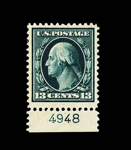 571 nh 339 image#339, 13c Blue green, a most impressive bottom sheet-margin plate no. 4948 single, possessing outstanding physical qualities, including being incredibly well centered amid immensely large margins for this value, plus its color is especially intense in an unusually deep shade, pristine o.g., n.h., an extremely fine gem; 1980 PF certificate. (Image) 75.00