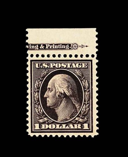 574 nh 342 image#342, $1.00 Violet brown, "post office" fresh top sheet-margin partial imprint single, featuring especially deep and luxuriant color, crisp detailed impression on bright paper, well centered within large margins, o.g., stamp n.h. (l.h. in selvage only), a very fine and choice stamp which is difficult to find never hinged; 1979 PF and 2001 PSE certificates. (Image) 950.00