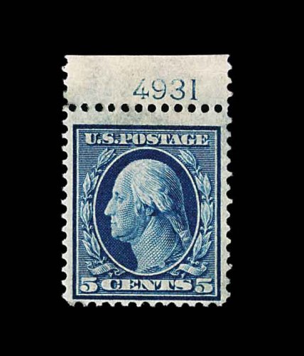 579 og 335a image#335a, 5c Blue on experimental "China Clay" paper, top sheet-margin plate no. 4931 single, nicely centered, deep rich color, slightly disturbed o.g., nearly very fine; plate number singles are rarely found on the "China Clay" papers; 1989 PF certificate. (Image) 1,000.00