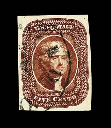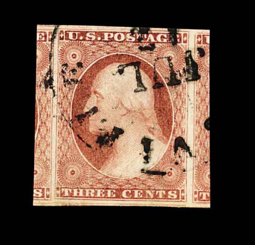 42 O 11 var. image#11 var., 3c Brownish carmine, gigantic margins, especially at sides which show significant portions of the adjoining stamps, margins at top and bottom are quite large, with bits of the frame lines of five adjacent stamps showing, rich luxuriant brownish carmine color, town c.d.s., an extremely fine gem; 2000 PF certificate. (Image) 12.00