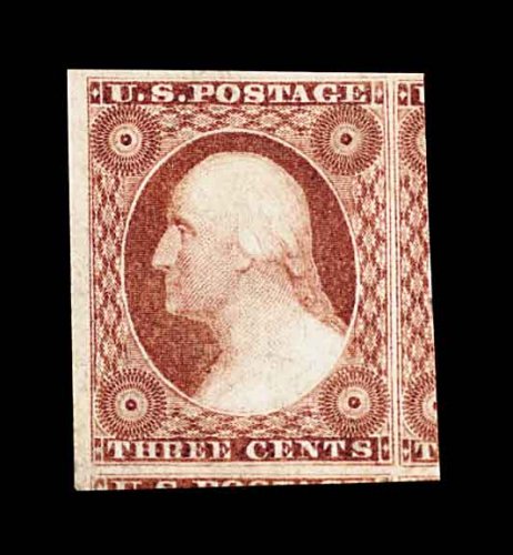 44 og 11 var. image#11 var., 3c Brownish claret, premium mint example of this scarce and distinctive color variety, featuring huge margins all around, including showing substantial portions of the stamps at right and bottom, sumptuously rich color and impression, full o.g., extremely fine; 1994 PF certificate specifically identifying this as the brownish claret color. (Image) 290.00
