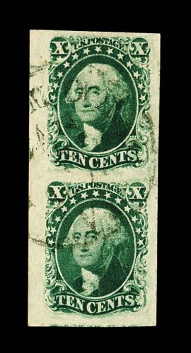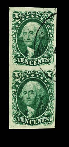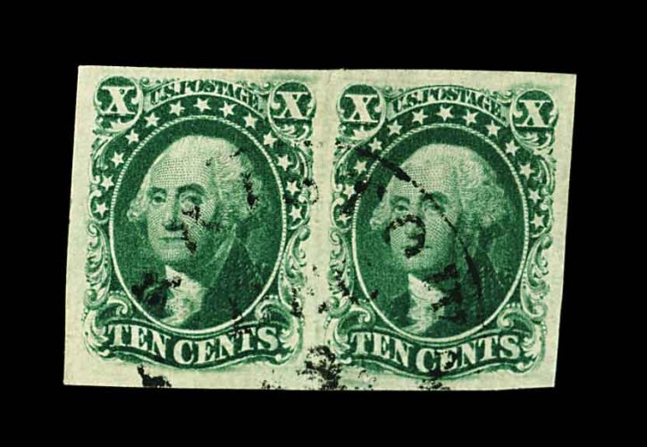 51 O 14, 15 image#14, 15, 10c Green, Ty. II and III combination pair, positions 51/61R1, left sheet-margin vertical pair, gigantic margins all around, gloriously rich color and an outstanding impression on bright paper, light central strike of a Richmond, Va. c.d.s., superb; a fabulous combination pair in the finest attainable quality; 1988 PF certificate. (Image) 500.00