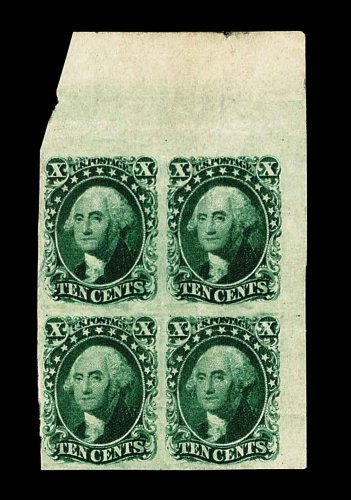 48 ogbl 14 image#14, 10c Green, Ty. II, a striking top right corner sheet-margin mint block of four, positions 9-10/19-20R1, top right stamp displays "curl" opposite left "X", and bottom right stamp shows a major double transfer in "Postage", fabulously fresh and bright, large to enormous margins all around, lovely deep shade and an excellent impression, full original gum, mild creases and a tiny sealed tear in the top left stamp, of extremely fine and spectacular appearance; quite likely unique as a corner margin block; an important multiple for the 1855 Ten Cent specialist; 1957 PF certificate; ex-Caspary and Hetherington. (Image) 16,000.00