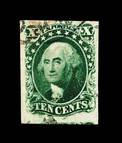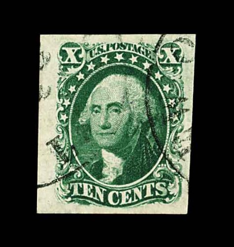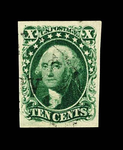54 O 16 image#16, 10c Green, Ty. IV, position 64L1, the only position on the sheet which produced the very rare recut at top and bottom variety, a superlative used example, featuring lavishly large margins all around, including a portion of the adjoining stamp at bottom, wonderfully vibrant color and a razor-sharp impression, beautifully postmarked with a face-free black cancel and a bit of a red cancel at top left, extremely fine gem; a magnificent example of the most desirable Ten Cent Type IV position, showing lines recut at both top and bottom; signed and plated on the reverse by Stanley Ashbrook and accompanied by a 1989 PF certificate; ex-Kelley. (Image) 2,150.00