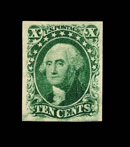 49 O 14 image#14, 10c Green, Ty. II, position 79R, four uniformly large margins, outstanding color and impression on bright paper, very light circular town datestamp, extremely fine gem; 1990 PF certificate. (Image) 225.00