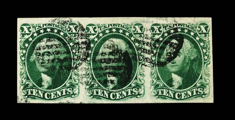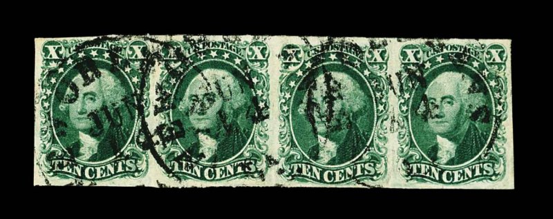 57 O 14, 16 image#14, 16, 10c Green, Ty. II/II/IV/II combination strip, positions 1-4R1, horizontal strip of four, with position 3R1 being the rare Type IV which is recut at top, featuring large and symmetrical margins all around, which is an uncommon occurrence for such a large multiple, deep luxuriant color and impression on bright paper, cancelled with multiple strikes of New Orleans town c.d.s., extremely fine; an especially handsome and rare combination strip; 1987 PF certificate. (Image) 2,600.00+