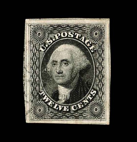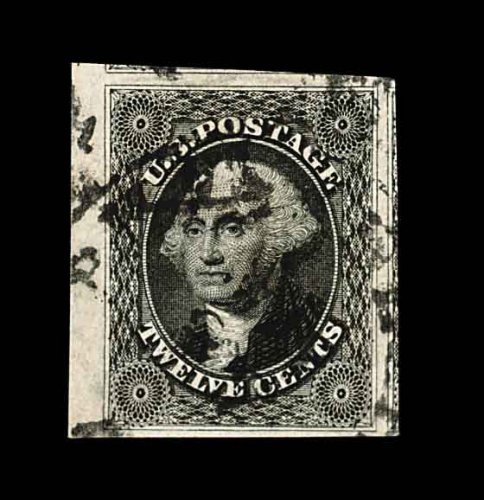 59 O 17 image#17, 12c Black, incredibly large margins all around, including a 2 1/2mm sheet margin at left, plus portions of adjoining stamps appearing at both top and at right, intensely rich color and a highly detailed impression, extremely fine gem; a striking and rare stamp with such sizable margins; 1989 PF certificate; ex-Weill Brothers. (Image) 325.00