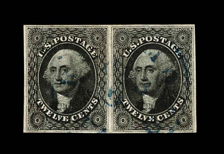 60 O 17, 17 var. image#17, 17 var., 12c Black, positions 27-28R1, horizontal pair, position 27R1 showing a major double transfer, with significant doubling of the letters at both top and bottom, large even margins all around, deep rich color and a crisp impression, light strike of deep blue c.d.s., extremely fine; a wonderful multiple for the Twelve Cent 1851 specialist or for the collector of gem used classics; 1979 and 1999 PF certificates. (Image) 710.00+