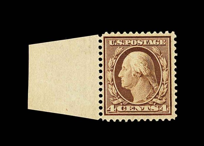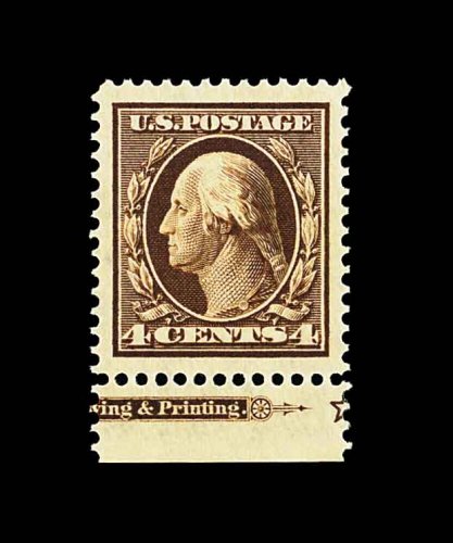 618 nh 377 image#377, 4c Brown, an incomparable bottom sheet-margin partial imprint single, being in a quality that simply cannot be improved upon, featuring superb centering amid gigantic jumbo margins, plus its color is especially rich and its impression prooflike, even its perforations are out of the ordinary, as they are unusually long and intact all around, pristine o.g., n.h., an extremely fine eye-arresting gem; 2000 PF certificate for a pair, this being the left stamp. (Image) 55.00