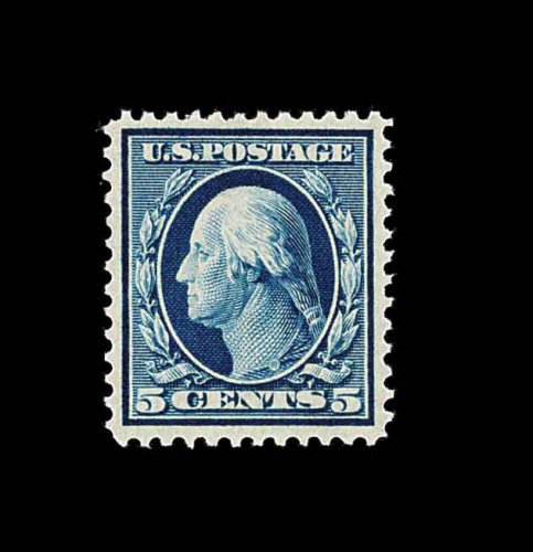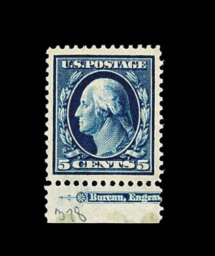 619 nh 378 image#378, 5c Blue, bottom sheet-margin partial imprint single, exceptionally large and well balanced margins, deep rich color, o.g., n.h., extremely fine. (Image) 55.00