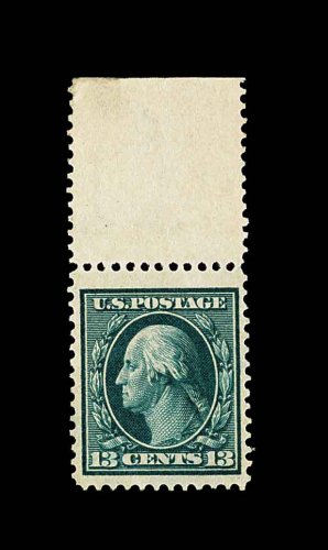 607 nh 365 image#365, 13c Blue green on bluish paper, a breathtakingly beautiful top sheet-margin mint example of this Bluish Paper rarity, being in a condition unlike any other we have ever had the pleasure to offer, possessing not only a fabulous overall brilliance and freshness, but its margins are absolutely immense as well, and wonderfully well centered within them, truly prooflike color and impression on immaculate paper, o.g., never hinged, there are a couple of truly insignificant natural gum skips mentioned for accuracy only, extremely fine; a most remarkable condition rarity; 1971 PF and 2001 PSE certificates. (Image) 4,750.00