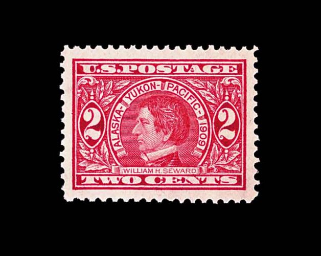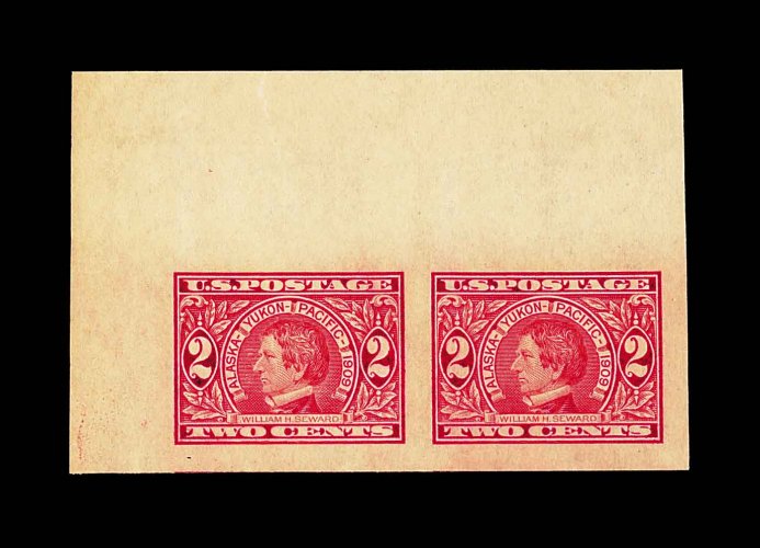 614 nh 371 image#371, 2c Alaska-Yukon, imperforate, top left corner sheet-margin horizontal pair, possessing absolutely gigantic margins all around, deep rich color, o.g., n.h., extremely fine; an eye-arresting gem mint pair. (Image) 95.00