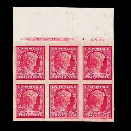 611 nhX 368 image#368, 2c Lincoln, imperforate, full top margin imprint, star and plate no. 4981 block of six, huge margins all around, bright color, o.g., n.h., extremely fine; a select example of this plate block. (Image) 275.00