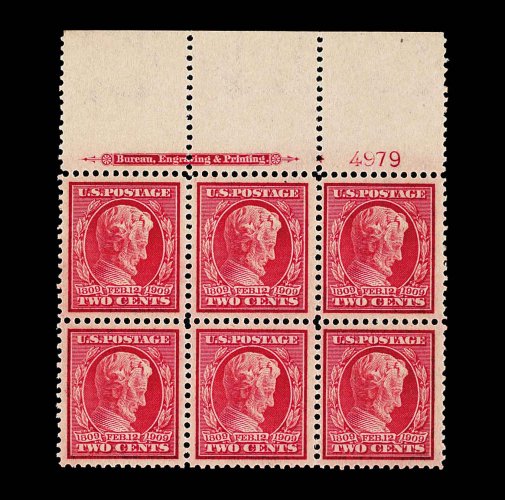 613 nhX 369 image#369, 2c Lincoln on bluish paper, a remarkable full top margin imprint, small star and plate no. 4979 block of six, in a quality that is rarely seen on this rare commemorative plate block, boasting extraordinary freshness and brilliance, radiant color and a crisp impression, fully intact and strong perforations, incredibly well centered for a plate block, o.g., n.h., extremely fine overall; a plate block for the collector who seeks only the finest available full top positions; 1990 PSE certificate; ex-Weisman. (Image) 4,400.00