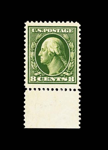 621 nh 380 image#380, 8c Olive green, bottom sheet-margin mint single, flawlessly centered amid incredibly large margins for this value, even its color and impression are outstanding, being truly prooflike on brilliantly white paper, o.g., n.h., there is a mild diagonal natural gum bend at top left mentioned solely for the sake of accuracy, an extremely fine gem; clear 1979 PF certificate. (Image) 200.00