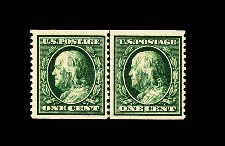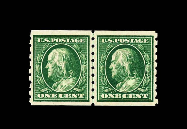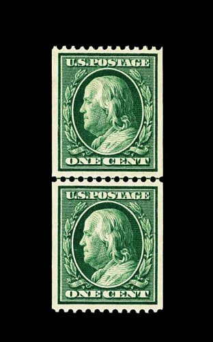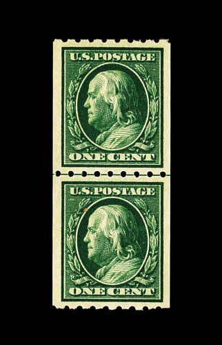 624 nh 385 image#385, 1c Green coil, perf. 12 horiz., guide line pair, mathematically precise centering (even the guide line between the stamps is perfectly positioned), large margins all around, deep luxuriant color, o.g., n.h., extremely fine gem; a very scarce line pair in the finest condition possible; 1979 PF certificate. (Image) 675.00