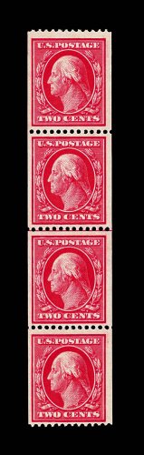 625 nh 386 image#386, 2c Carmine coil, perf. 12 horiz., guide line strip of four, unusually fresh and bright, deep "fiery" color and a strong impression, well centered and margined, pristine o.g., n.h., a very fine and especially choice line strip of four of this truly rare and often faked coil; 1979 PF certificate. (Image) 1,510.00+