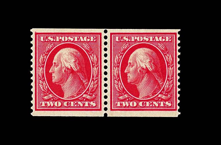 632 nh 393 image#393, 2c Carmine coil, perf. 8 1/2 vert., guide line pair, a fabulous quality example of this very scarce line pair, possessing an incredible overall brilliance, with prooflike color and impression on immaculate paper, beautifully centered within extraordinarily large margins, pristine o.g., n.h., extremely fine; easily one of the finest #393 line pairs that exists; 1980 PF certificate. (Image) 475.00