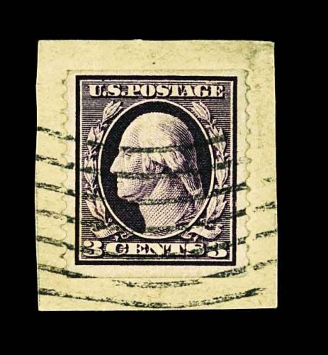 628 O 389 image#389, 3c Deep violet, Ty. I, "Orangeburg Coil", perf. 12 vert., extraordinarily well centered for this difficult stamp, possessing large and rather well balanced margins, characteristic deep violet shade, tied to small piece by the usual wavy line machine postmark, completely free of any of the faults so often associated with the majority of known examples, extremely fine for this. The "Orangeburg" coil was issued in 1911, in very limited quantities, specifically for use by the Bell Pharmaceutical Co. to mail their samples to doctors. The stamp offered here is still on a small piece of the original mailing envelope which contained just such a sample. Any example of the Three Cent "Orangeburg" coil is a major rarity. However, to find one fault free is an especially difficult challenge, as many were slightly damaged due to the contents of the envelope being a bit bulky, often resulting in creases. The ultimate challenge is to find an example that is not only fault free, but possesses choice centering as well. Such is the case with the example offered here, being one of a very few known examples that is both sound and can boast exceptional centering. Accompanied by a 1954 letter of authenticity from Stanley Gibbons, as well as a 1988 PF certificate: ex-Stollnitz. (Image) for fine 11,500.00