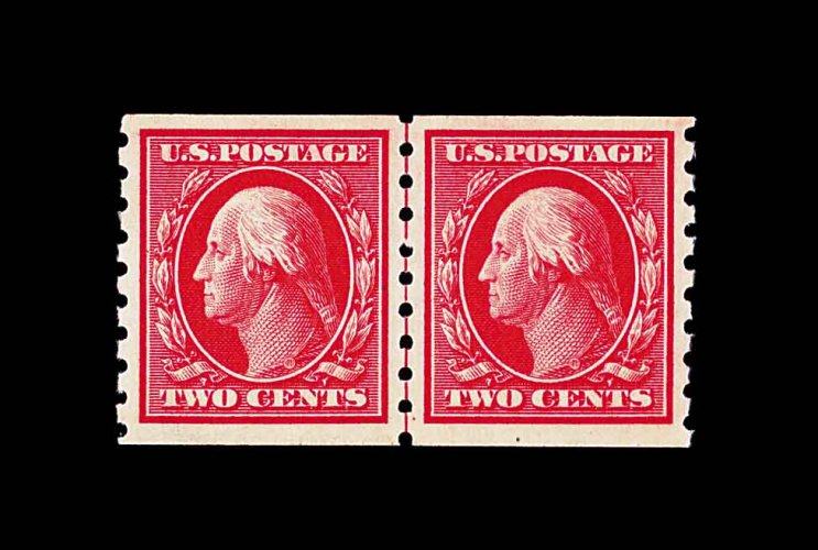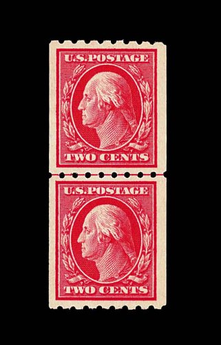 630 nh 391 image#391, 2c Carmine coil, perf. 8 1/2 horiz., guide line pair, magnificently centered, with huge margins all around which are most uncharacteristic, luxuriously rich color and a razor-sharp impression on bright crisp paper, pristine o.g., n.h., extremely fine gem; this line pair's equal may be impossible to find; 1980 PF certificate. (Image) 425.00
