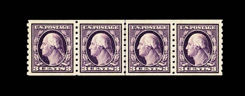 633 og/nh 394 image#394, 3c Deep violet coil, perf. 8 1/2 vert., guide line strip of four, perfectly centered, with each stamp possessing huge balanced margins all around, gorgeous rich color and a crisp detailed impression on bright paper, o.g., two end stamps lightly hinged, line pair itself is n.h., extremely fine; a magnificent quality line strip of four which contains the finest never hinged line pair of a #394 that can possibly exist; (Image) 780.00+
