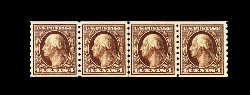 634 nh 395 image#395, 4c Brown coil, perf. 8 1/2 vert., guide line strip of four, remarkably fresh and choice, lovely rich color and a crisp detailed impression on immaculate paper, outstanding centering as well, with large margins all around, unblemished o.g., n.h., extremely fine; a handsome example of this very scarce line strip; 1979 PF certificate. (Image) 855.00+