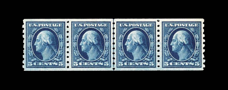 635 nh 396 image#396, 5c Blue coil, perf. 8 1/2 vert., guide line strip of four, each stamp in this remarkable line strip is spectacularly well centered within extraordinarily large margins, its color is a most unusual pastel shade on crisp paper that has marvelous overall plate wash, pristine o.g., n.h., extremely fine and striking; 1979 PF certificate. (Image) 855.00+